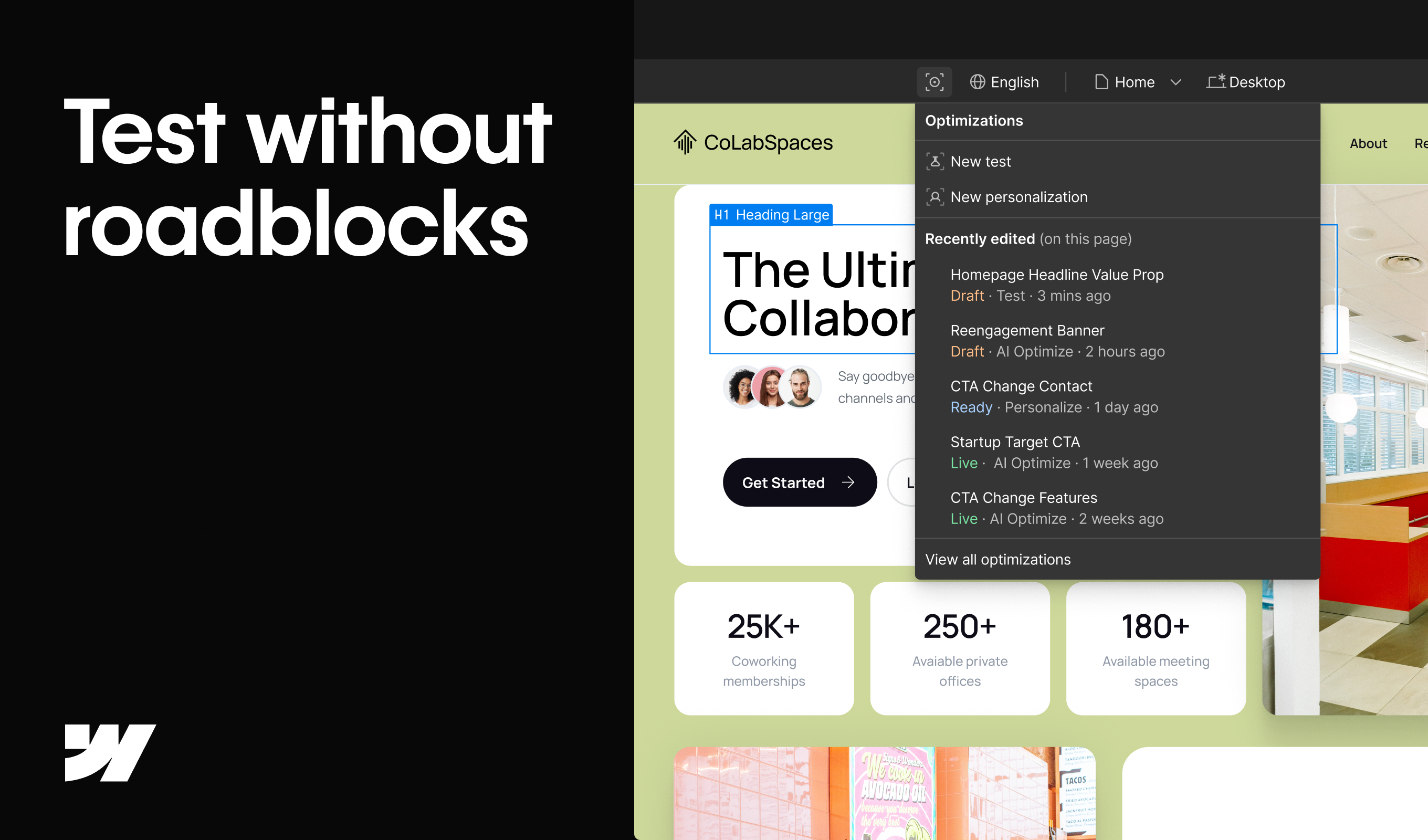 - Set up tests for something as small as a copy change or as large as a sitewide navigation element with just a few clicks.