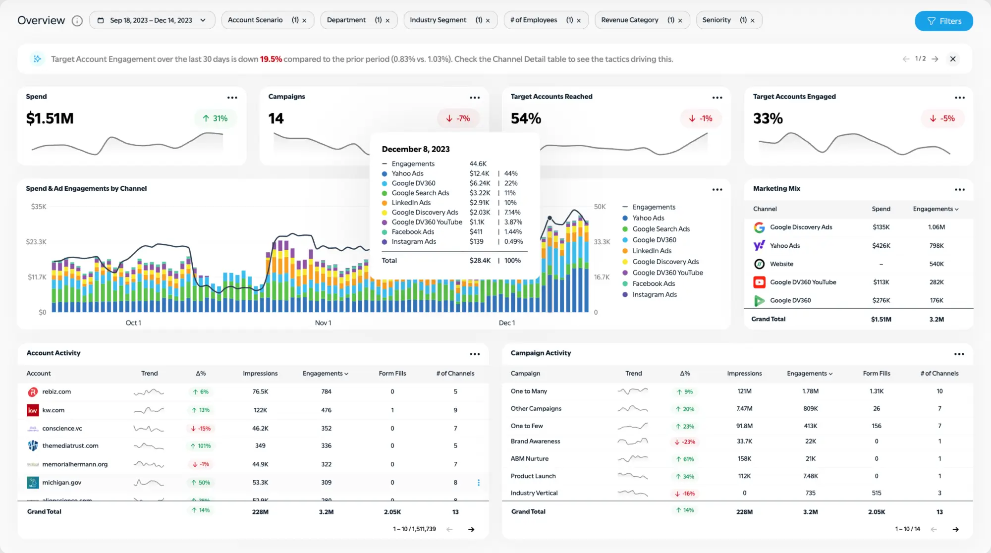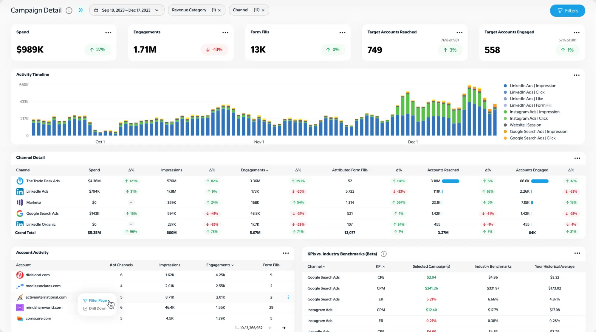 Compare account-based performance across channels with auto-calculated KPIs and industry benchmarks