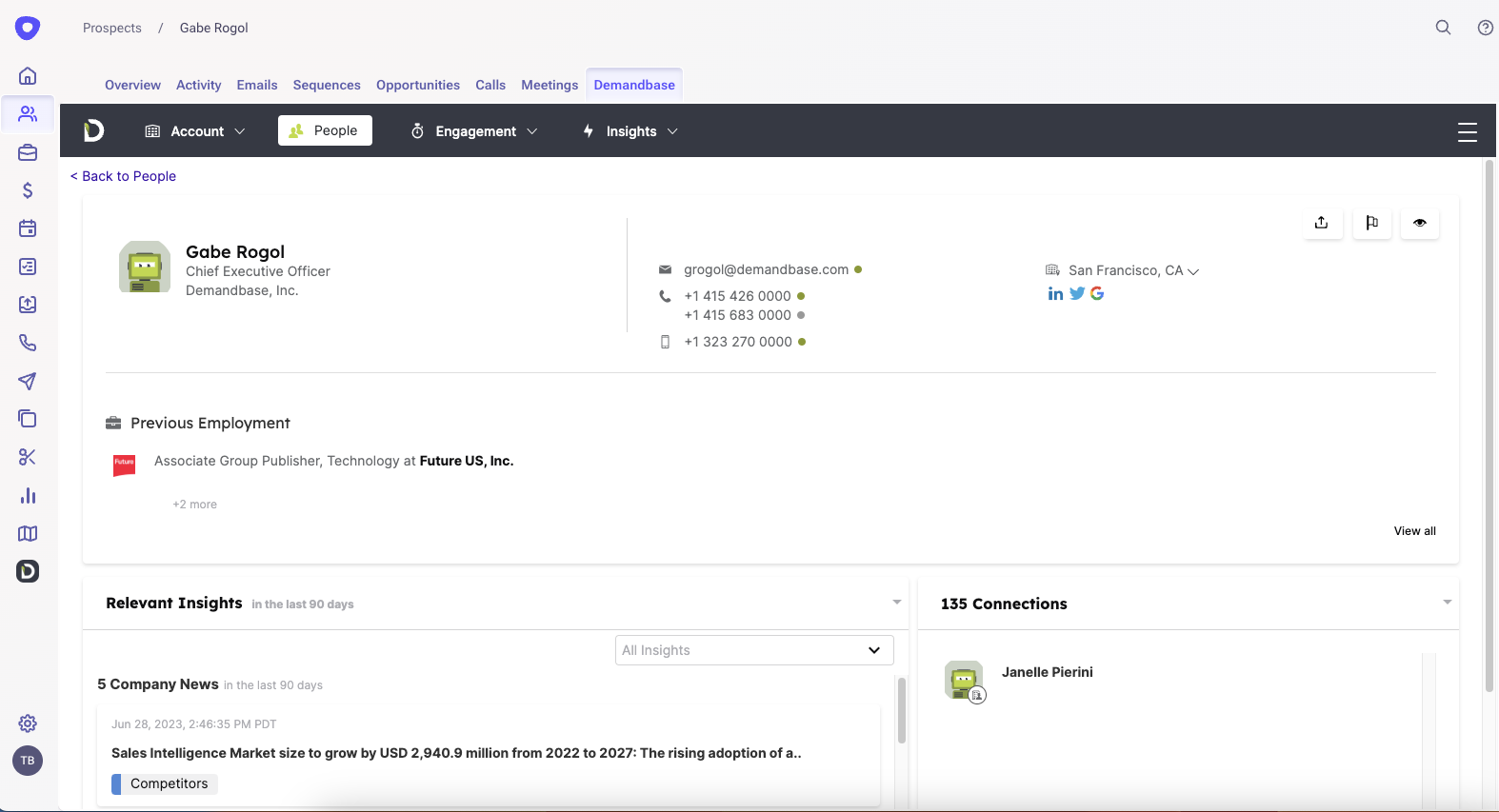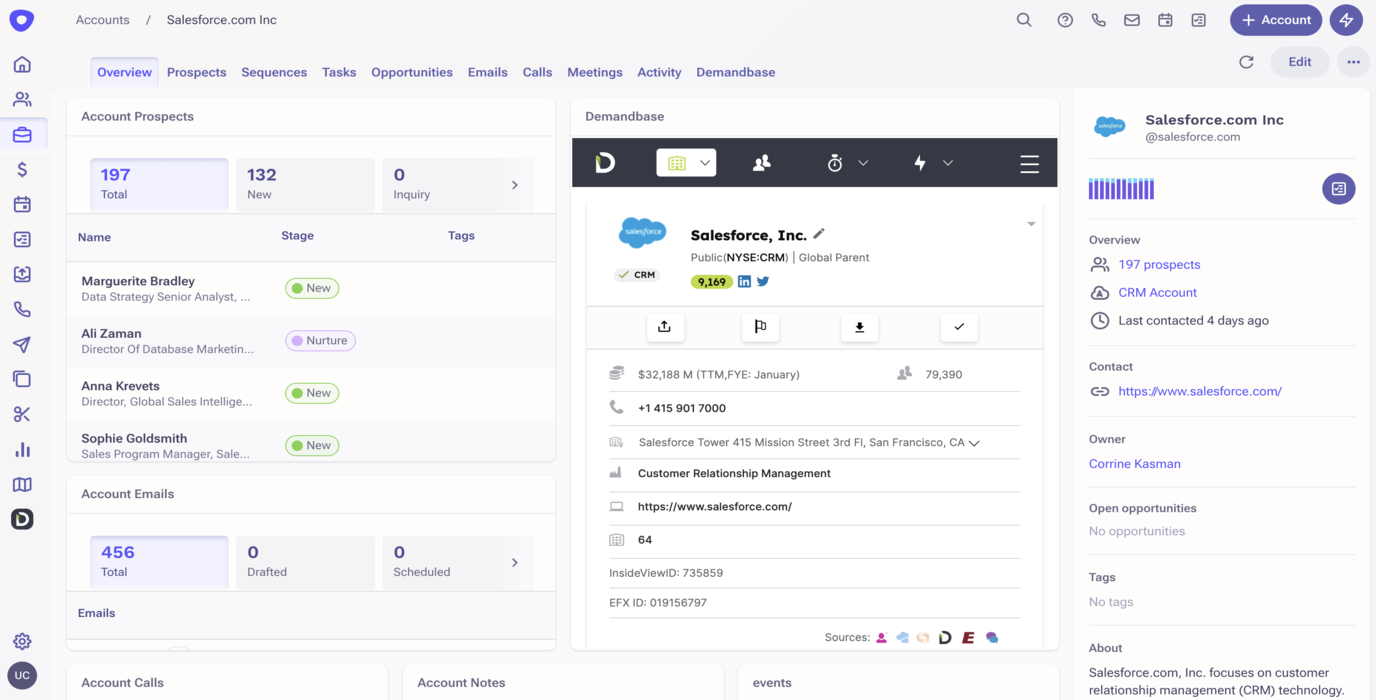 - View contact info, connections, communication history, engagement activity and more on the Account, Prospect, and Opportunity tabs within Outreach.